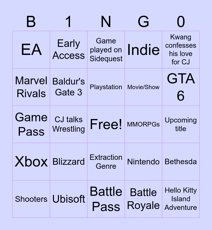 This bingo card has a free space and 24 words: Blizzard, Ubisoft, Playstation, Shooters, Kwang confesses his love for CJ, EA, Marvel Rivals, Early Access, MMORPGs, Extraction Genre, Movie/Show, Game Pass, Nintendo, Bethesda, Baldur's Gate 3, Battle Royale, Upcoming title, Game played on Sidequest, GTA 6, CJ talks Wrestling, Hello Kitty Island Adventure, Xbox, Indie and Battle Pass.