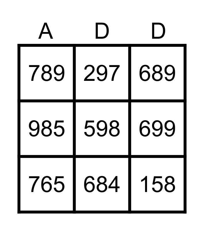This bingo card has 9 words: 765, 689, 297, 985, 789, 699, 598, 158 and 684.