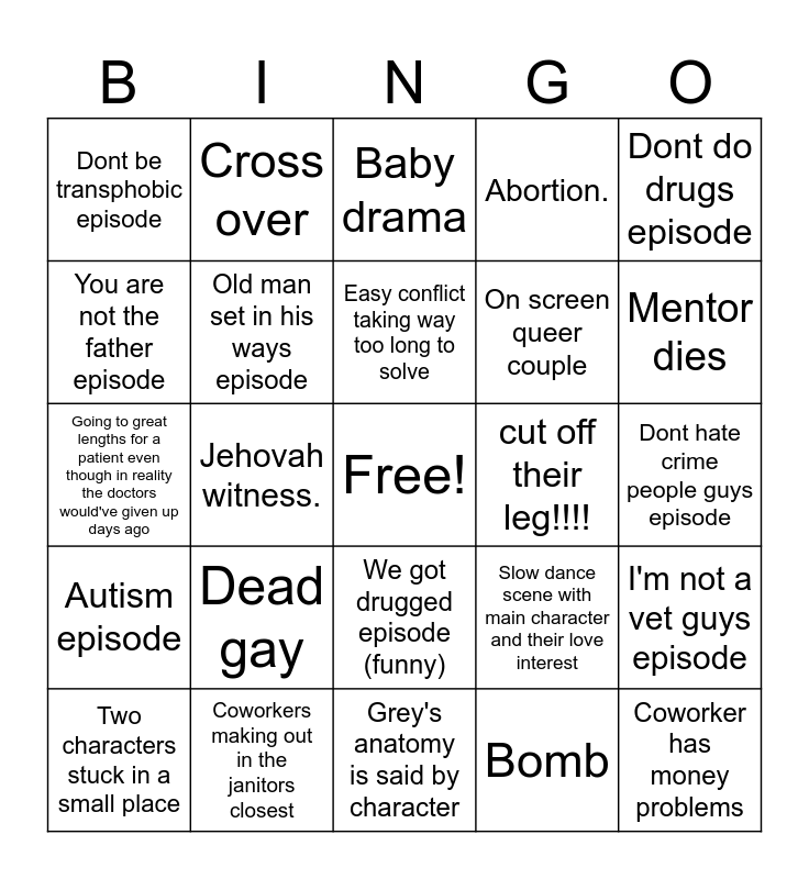 This bingo card has a free space and 24 words: Dead gay, Coworkers making out in the janitors closest, Easy conflict taking way too long to solve, Two characters stuck in a small place, Dont do drugs episode, Dont be transphobic episode, You are not the father episode, Cross over, cut off their leg!!!!, We got drugged episode (funny), On screen queer couple, Going to great lengths for a patient even though in reality the doctors would've given up days ago, Slow dance scene with main character and their love interest, I'm not a vet guys episode, Old man set in his ways episode, Bomb, Dont hate crime people guys episode, Baby drama, Mentor dies, Jehovah witness., Coworker has money problems, Autism episode, Abortion. and Grey's anatomy is said by character.