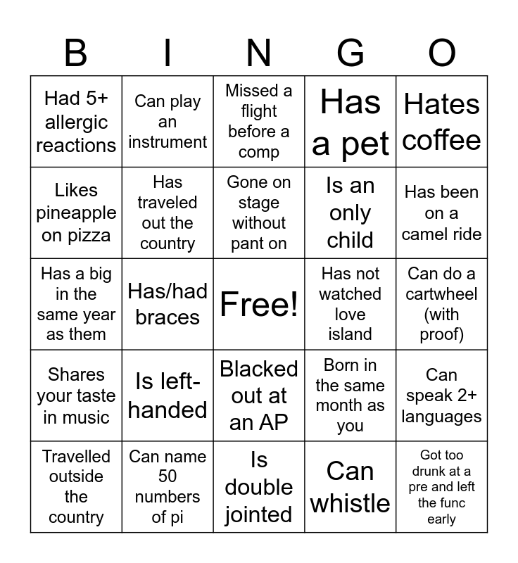 This bingo card has a free space and 24 words: Is left-handed, Can name 50 numbers of pi, Gone on stage without pant on, Travelled outside the country, Hates coffee, Had 5+ allergic reactions, Likes pineapple on pizza, Can play an instrument, Has not watched love island, Blacked out at an AP, Is an only child, Has a big in the same year as them, Born in the same month as you, Can speak 2+ languages, Has traveled out the country, Can whistle, Can do a cartwheel (with proof), Missed a flight before a comp, Has been on a camel ride, Has/had braces, Got too drunk at a pre and left the func early, Shares your taste in music, Has a pet and Is double jointed.