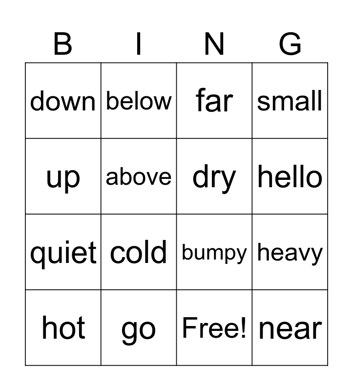 This bingo card has 26 words: fast, slow, hello, goodbye, up, down, above, below, Free!, noisy, quiet, bumpy, flat, light, heavy, big, small, near, far, hot, cold, come, go, wet, dry and Rose!.