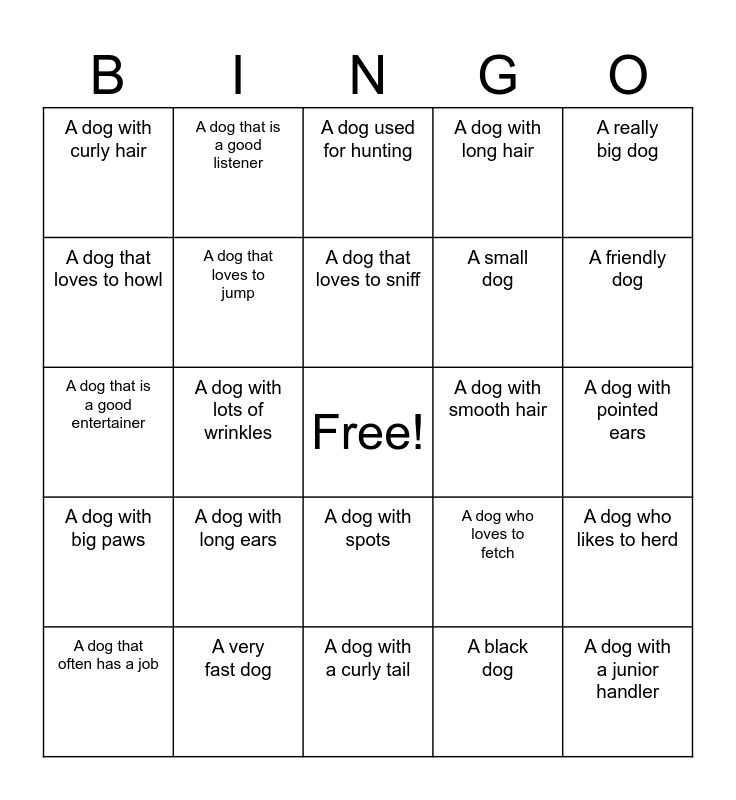 This bingo card has a free space and 24 words: A dog with long ears, A very fast dog, A dog that loves to sniff, A dog that often has a job, A really big dog, A dog with curly hair, A dog that loves to howl, A dog that is a good listener, A dog with smooth hair, A dog with spots, A small dog, A dog that is a good entertainer, A dog who loves to fetch, A dog who likes to herd, A dog that loves to jump, A black dog, A dog with pointed ears, A dog used for hunting, A friendly dog, A dog with lots of wrinkles, A dog with a junior handler, A dog with big paws, A dog with long hair and A dog with a curly tail.