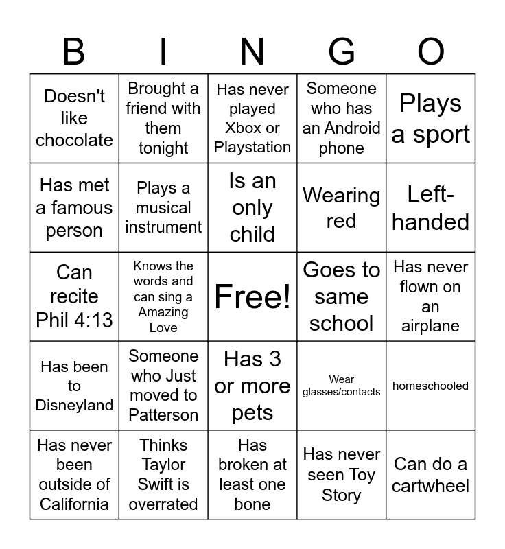 This bingo card has a free space and 24 words: Has never been outside of California, Someone who Just moved to Patterson, Is an only child, Has never seen Toy Story, Plays a sport, Doesn't like chocolate, Brought a friend with them tonight, Has never played Xbox or Playstation, Goes to same school, Has never flown on an airplane, Can recite Phil 4:13, Plays a musical instrument, Wear glasses/contacts, homeschooled, Has met a famous person, Thinks Taylor Swift is overrated, Has broken at least one bone, Someone who has an Android phone, Left-handed, Has been to Disneyland, Knows the words and can sing a Amazing Love, Has 3 or more pets, Wearing red and Can do a cartwheel.