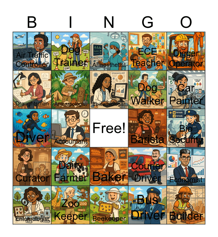 This bingo card has 30 images, a free space and 30 words: Zoo Keeper, Plane Refuller, Accountant, Animal Control, Air Traffic Controller, Anaesthetist, Anthropologist, Baker, Barista, Beekeeper, Bio Security, Builder, Bus Driver, Butcher, Car Painter, Chef, Courier Driver, Curator, Dairy Farmer, Digger Operator, Diver, Dog Groomer, Dog Trainer, Dog Walker, Draughtsman, ECE Teacher, Economist, Entomologist, Epidemiologist and Exterminator.
