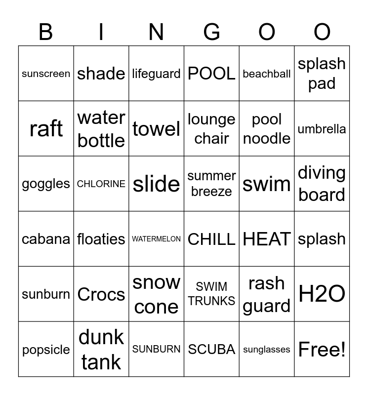 This bingo card has 42 words: sunglasses, water bottle, sun hat, swim, splash, floaties, goggles, swimwear, lifeguard, diving board, slide, lounge chair, umbrella, beachball, dunk tank, cabana, H2O, pool noodle, Free!, shade, splash pad, snow cone, sunburn, sunscreen, tanning, popsicle, towel, flip flops, Crocs, rash guard, slip and slide, summer breeze, raft, HEAT, SUNBURN, WATERMELON, CHILL, CHLORINE, SWIM TRUNKS, SCUBA, POOL and SMOOTHIE.
