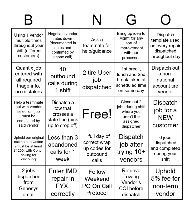This bingo card has a free space and 24 words: Less than 3 abandoned calls for 1 week, Enter IMD repair in FYX, correctly, 2 tire Uber job dispatched, 2 jobs dispatched from Genesys email, Dispatch template used on every repair dispatched throughout day, Using 1 vendor multiple times throughout your shift (different customers), Quantix job entered with all required triage info, no mistakes, Negotiate vendor rates down (documented in notes and confirmed by phone call), Close out 2 jobs during shift where you aren’t the assigned dispatcher, 1 full day of correct wrap up codes for outbound calls, 1st break, lunch and 2nd break taken at scheduled time on same day, Help a teammate out with vendor selection, job must be completed by said vendor, Dispatch job after trying 10+ vendors, 6 jobs dispatched and completed during your shift, 40 outbound calls during 1 shift, Retrieve Towing Vendor’s COI before dispatch, Dispatch job for a NEW customer, Ask a teammate for help/guidance, Dispatch out a non-national account tire vendor, Dispatch a tow that crosses a state line (pick up to drop off), Uphold 5% fee for non-term vendor, Uphold our original estimate to Colton (must be at least $1200, with Colton asking for discount), Bring up idea to Mgmt for any sort of improvement with our processes and Follow Weekend PO On Call Protocol.