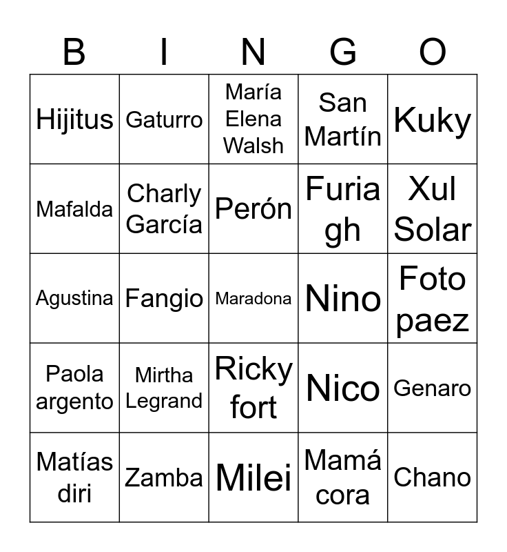 This bingo card has 25 words: Mirtha Legrand, Milei, Perón, Matías diri, Kuky, Hijitus, Mafalda, Gaturro, Nino, Ricky fort, Furia gh, Agustina, Nico, Genaro, Charly García, Chano, Foto paez, María Elena Walsh, Xul Solar, Fangio, Maradona, Zamba, Paola argento, San Martín and Mamá cora.