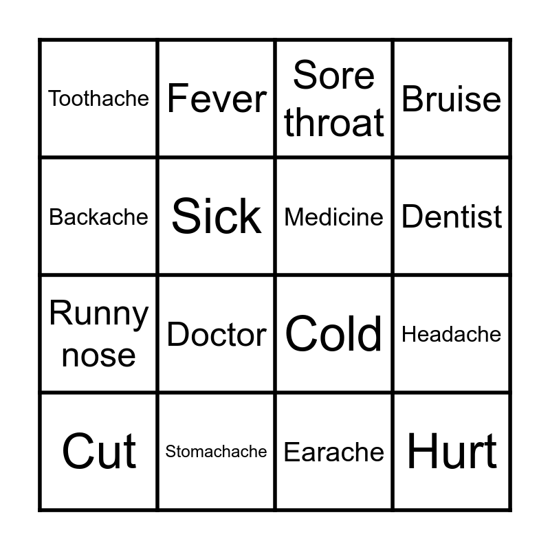 This bingo card has 16 words: Stomachache, Headache, Sore throat, Toothache, Runny nose, Fever, Cold, Earache, Backache, Sick, Cut, Bruise, Doctor, Dentist, Medicine and Hurt.