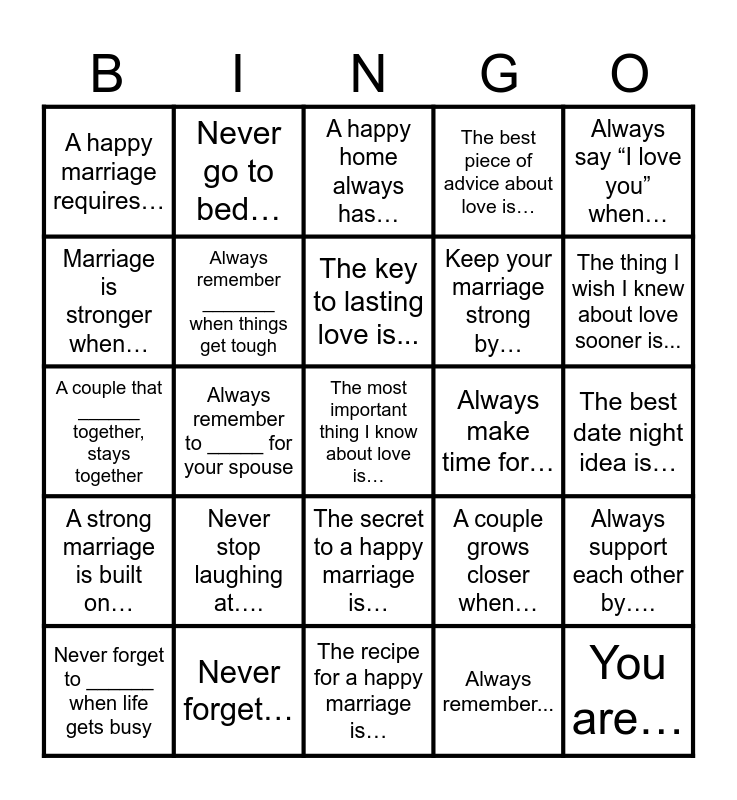 This bingo card has 26 words: The secret to a happy marriage is…, Always remember..., The key to lasting love is..., Never forget…, Always say “I love you” when…, A happy marriage requires…, Marriage is stronger when…, Never go to bed…, The best date night idea is…, A couple grows closer when…, Keep your marriage strong by…, A couple that ______ together, stays together, Always support each other by…., Never forget to ______ when life gets busy, Always remember to _____ for your spouse, The best way to show love is _____, The best piece of advice about love is…, A strong marriage is built on…, A happy home always has…, The most important thing I know about love is…, The thing I wish I knew about love sooner is..., The recipe for a happy marriage is…, Always make time for…, Never stop laughing at…., Always remember _______ when things get tough and You are….