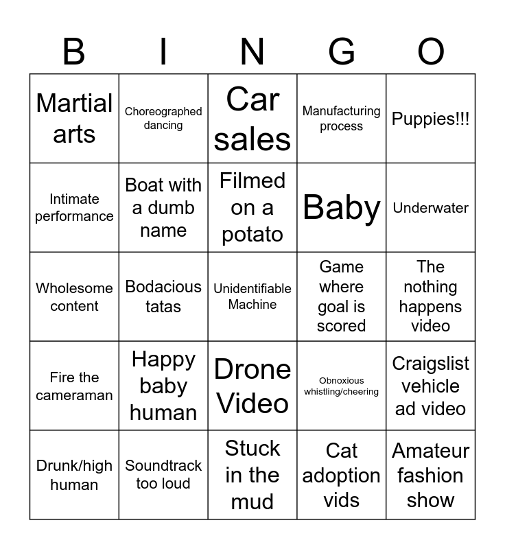 This bingo card has 50 words: Free!, Unidentifiable Machine, Slo-mo, Stuck in the mud, Happy baby human, Sad baby human, Choreographed dancing, Finger in shot, Intimate performance, Low-Quality Security Camera, Boat with a dumb name, Manufacturing process, Craigslist vehicle ad video, Obnoxious whistling/cheering, Craftsman at work, Why does this exist???, Filmed on a potato, Game where goal is scored, Abrupt ending, Puppies!!!, Bodacious tatas, Cat adoption vids, Martial arts, Baby, Machine diagnostics video, Amateur fashion show, Underwater, Sideways video, Car sales, Drone Video, Amateur Sports Game, Parade, Awwwkwarrrd moment, Random bodily sounds (like coughing or farting), Soundtrack too loud, Text-to-speech narrator, Unfinished project, Sudden screaming, Poor man’s special effects, The nothing happens video, Camera pointed at TV/computer monitor, Background TV blaring, Shaky cam nausea, Crappy music/musician, Drunk/high human, Wholesome content, Angry human, Sad human, Fire the cameraman and Stalker/creep.