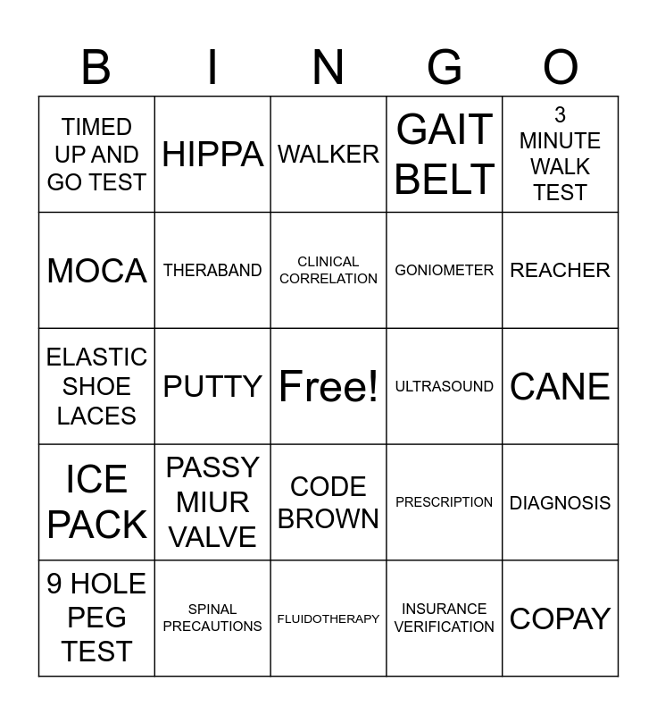 This bingo card has a free space and 29 words: 9 HOLE PEG TEST, WEIGHTS, PUTTY, SOCK AID, TIMED UP AND GO TEST, WALKER, THERABAND, PASSY MIUR VALVE, ULTRASOUND, SPINAL PRECAUTIONS, CANE, COPAY, FLUIDOTHERAPY, INSURANCE VERIFICATION, REACHER, GOALS, CODE BROWN, ICE PACK, 3 MINUTE WALK TEST, ELASTIC SHOE LACES, PRESCRIPTION, MODIFIED BARIUM SWALLOW, GONIOMETER, MOCA, GAIT BELT, HIPPA, DIAGNOSIS, CLINICAL CORRELATION and CUSTOM HAND SPLINT.