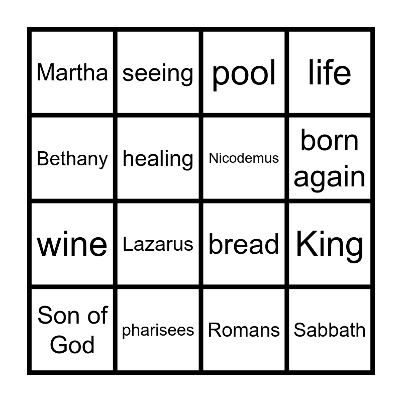 This bingo card has 28 words: Free!, water, wine, wedding, healing, pool, seeing, Sabbath, pharisees, mat, bread, life, disciples, believe, Lazarus, Jerusalem, eternal, Nicodemus, born again, Mary, Martha, feeding, Son of God, King, Romans, John, Bethany and tomb.
