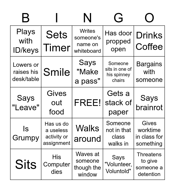 This bingo card has a free space and 34 words: Plays a video, Says "Volunteer, Voluntold", Has music playing, Gives out a charger, Is Grumpy, Smile, Drinks Coffee, Sits, Sets Timer, Calls on a random person, Says "Make a pass", Writes someone's name on whiteboard, Sarcasm, Has pen in hand, Gets a stack of paper, Bargains with someone, His Computer dies, Says "Leave", Has us do a useless activity or assignment, Someone not in that class walks in, Walks around, Crosses Arms, Plays with ID/keys, Says brainrot, Waves at someone though the window, Threatens to give someone a detention, Has door propped open, Gives out a textbook to someone, Someone sits in one of his spinney chairs, Lowers or raises his desk/table, Changes the slide, Gives out food, Gives worktime in class for something and Threatens to move due date for something.
