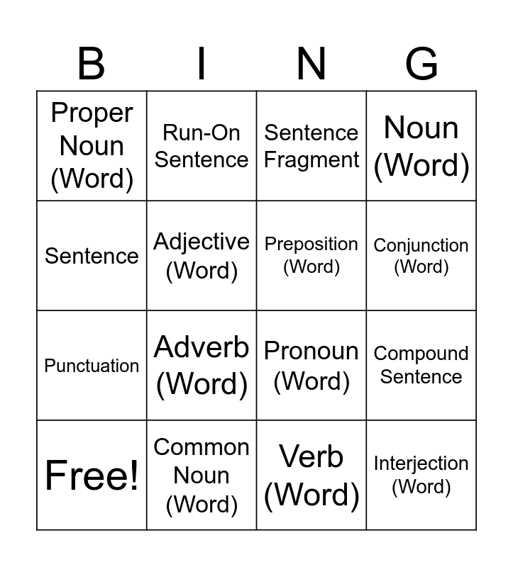 This bingo card has 16 words: Common Noun (Word), Compound Sentence, Sentence Fragment, Proper Noun (Word), Punctuation, Run-On Sentence, Pronoun (Word), Verb (Word), Sentence, Adjective (Word), Free!, Noun (Word), Adverb (Word), Conjunction (Word), Preposition (Word) and Interjection (Word).