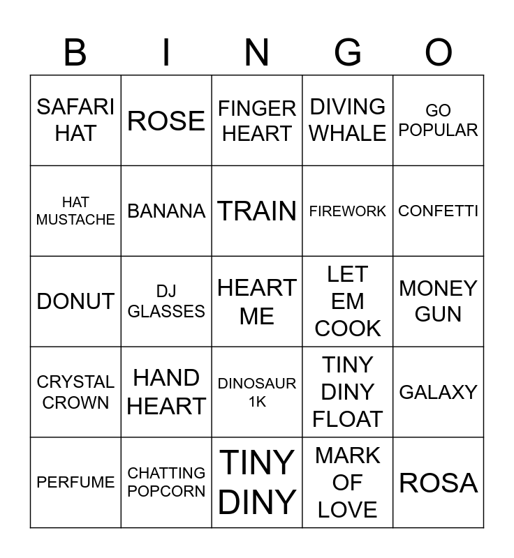 This bingo card has a free space and 24 words: HAND HEART, CHATTING POPCORN, TRAIN, PERFUME, GO POPULAR, SAFARI HAT, HAT MUSTACHE, ROSE, LET EM COOK, DINOSAUR 1K, FIREWORK, DONUT, TINY DINY FLOAT, GALAXY, BANANA, MARK OF LOVE, MONEY GUN, FINGER HEART, CONFETTI, DJ GLASSES, ROSA, CRYSTAL CROWN, DIVING WHALE and TINY DINY.