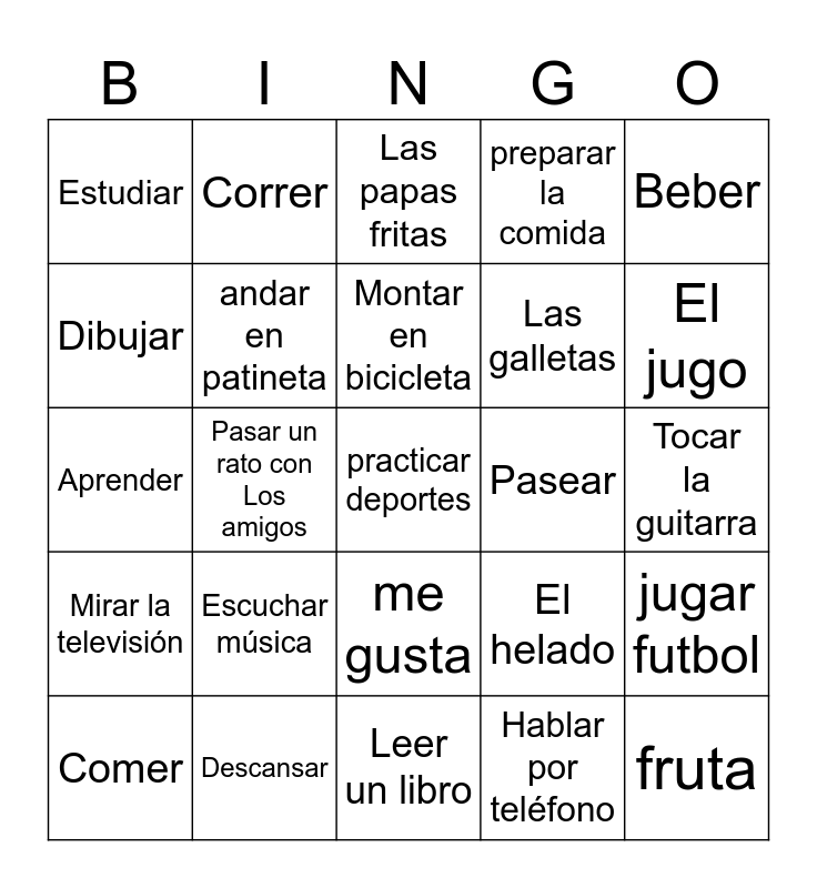 This bingo card has a free space and 24 words: Escuchar música, Descansar, Montar en bicicleta, Comer, Beber, Estudiar, Dibujar, Correr, Pasear, me gusta, Las galletas, Aprender, El helado, jugar futbol, andar en patineta, Hablar por teléfono, Tocar la guitarra, Las papas fritas, El jugo, Pasar un rato con Los amigos, fruta, Mirar la televisión, preparar la comida and Leer un libro.