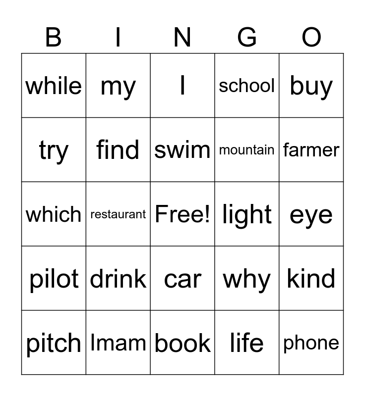 This bingo card has a free space and 24 words: pitch, drink, swim, life, buy, while, my, I, light, eye, which, find, why, kind, try, Imam, book, school, farmer, pilot, restaurant, car, mountain and phone.