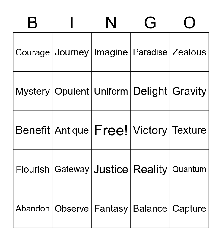 This bingo card has a free space and 50 words: Balloon, Capture, Diamond, Fantasy, Gateway, Harvest, Journey, Lantern, Mystery, Network, Opulent, Paradise, Quantum, Reality, Science, Triumph, Uniform, Victory, Welcome, Zealous, Antique, Balance, Courage, Delight, Explore, Freedom, Gravity, Horizon, Imagine, Justice, Kingdom, Liberty, Magnify, Nostalg, Observe, Passion, Quality, Respect, Success, Texture, Uncover, Venture, Wisdom, Zephyr, Abandon, Benefit, Dynamic, Eclipse, Flourish and Genuine.