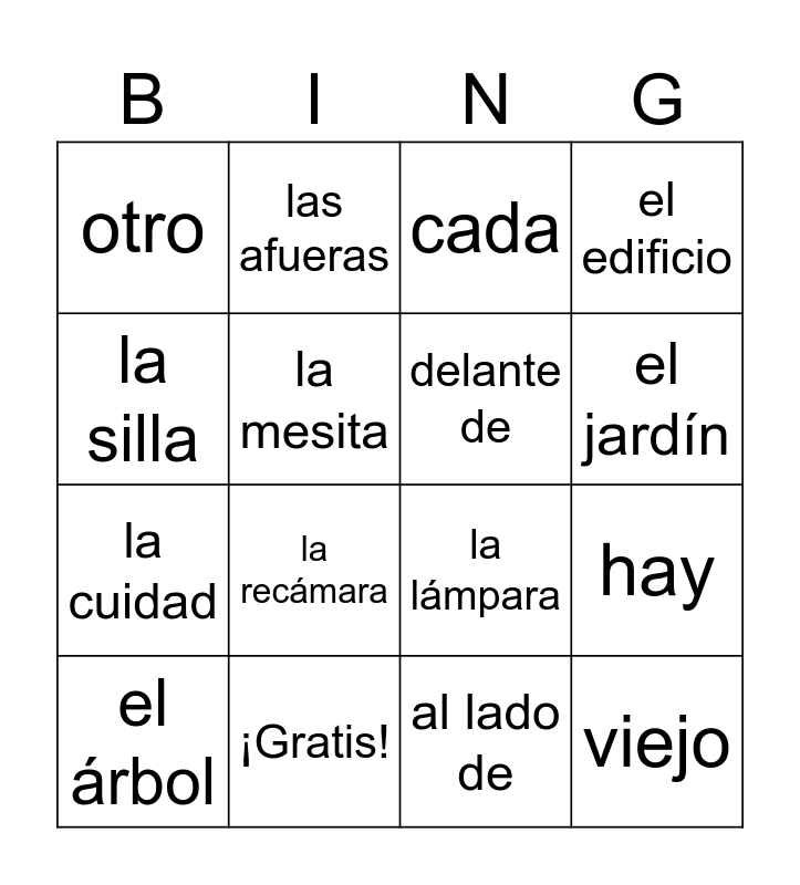 This bingo card has 16 words: ¡Gratis!, hay, cada, otro, la cuidad, las afueras, la lámpara, al lado de, la silla, la mesita, el árbol, el edificio, la recámara, el jardín, delante de and viejo.