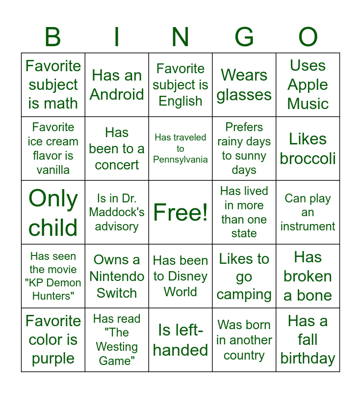 This bingo card has a free space and 34 words: Has a dog, Was born in another country, Favorite food is pizza, Is the youngest sibling, Has seen the movie "KP Demon Hunters", Has been to a concert, Uses Apple Music, Favorite color is purple, Has an Android, Likes to skateboard, Has traveled to Pennsylvania, Favorite subject is English, Has seen a Broadway show, Favorite sport is soccer, Has lived in more than one state, Likes broccoli, Has read "The Westing Game", Only child, Owns a Nintendo Switch, Likes to go camping, Has been to Disney World, Has gone surfing, Favorite subject is math, Can play an instrument, Is left-handed, Has a fall birthday, Wears glasses, Can speak another language fluently, Prefers rainy days to sunny days, Favorite ice cream flavor is vanilla, Is new to Williston this year, Is in Dr. Maddock's advisory, Has broken a bone and Sings in the shower.