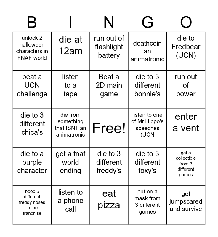 This bingo card has a free space and 24 words: get a fnaf world ending, listen to a phone call, Beat a 2D main game, boop 5 different freddy noses in the franchise, die to Fredbear (UCN), unlock 2 halloween characters in FNAF world, beat a UCN challenge, die at 12am, listen to one of Mr.Hippo's speeches (UCN, die to 3 different freddy's, die to 3 different bonnie's, die to 3 different chica's, die to 3 different foxy's, get a collectible from 3 different games, listen to a tape, put on a mask from 3 different games, enter a vent, run out of flashlight battery, run out of power, die from something that ISNT an animatronic, get jumpscared and survive, die to a purple character, deathcoin an animatronic and eat pizza.