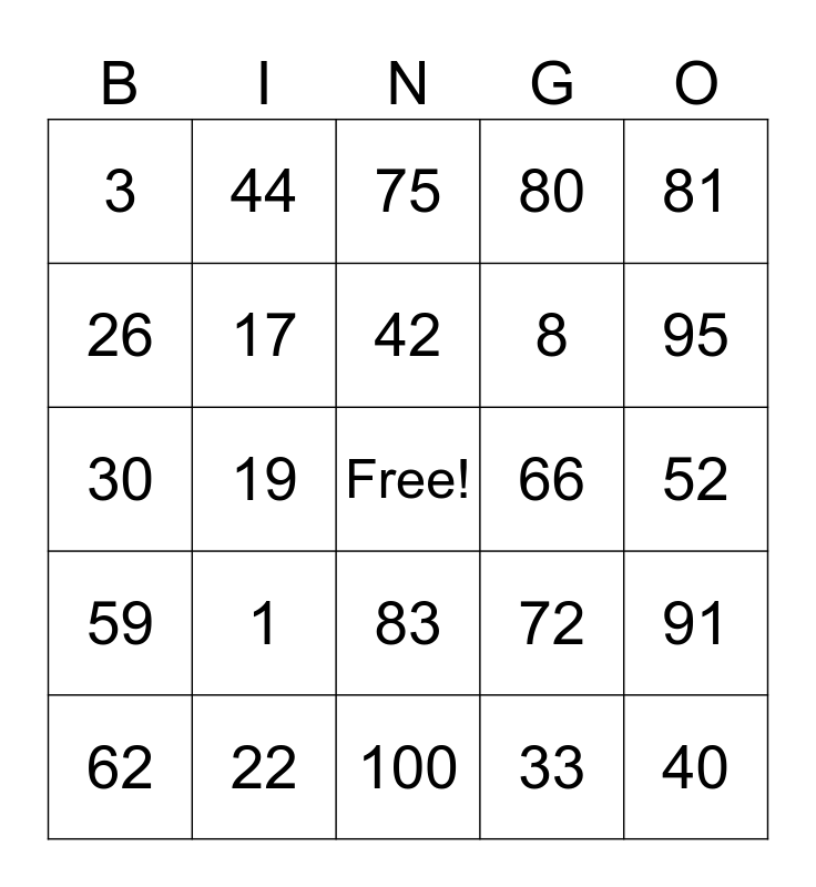 This bingo card has a free space and 24 words: 1, 22, 42, 62, 81, 3, 26, 44, 66, 83, 8, 30, 72, 91, 17, 33, 52, 75, 95, 19, 40, 59, 80 and 100.