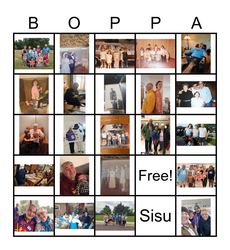 This bingo card has 23 images and 2 words: Free! and Sisu.