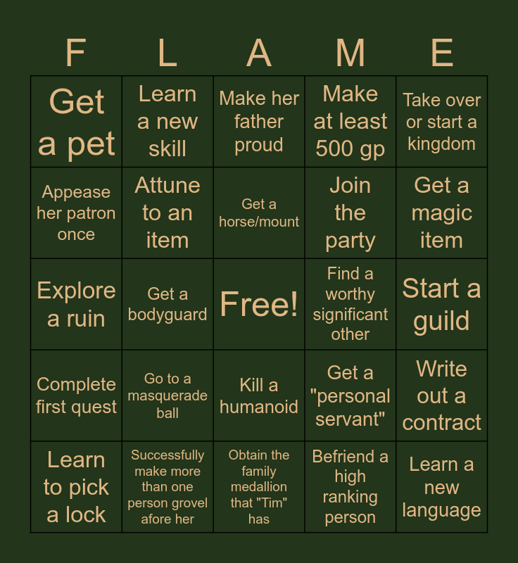 This bingo card has a free space and 24 words: Go to a masquerade ball, Successfully make more than one person grovel afore her, Get a horse/mount, Learn to pick a lock, Take over or start a kingdom, Get a pet, Appease her patron once, Learn a new skill, Find a worthy significant other, Kill a humanoid, Join the party, Explore a ruin, Get a "personal servant", Write out a contract, Attune to an item, Befriend a high ranking person, Start a guild, Make her father proud, Get a magic item, Get a bodyguard, Learn a new language, Complete first quest, Make at least 500 gp and Obtain the family medallion that "Tim" has.