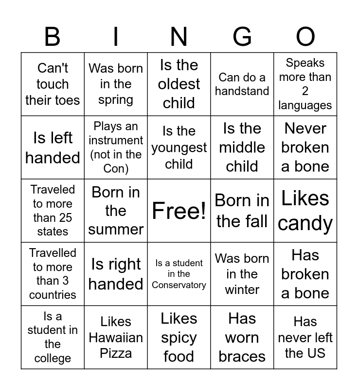 This bingo card has a free space and 26 words: Is a student in the Conservatory, Has worn braces, Is the youngest child, Likes Hawaiian Pizza, Speaks more than 2 languages, Can't touch their toes, Is left handed, Was born in the spring, Likes candy, Was born in the winter, Is the middle child, Traveled to more than 25 states, Has broken a bone, Is a student in the college, Born in the summer, Has a pet, Can do a handstand, Travelled to more than 3 countries, Is the oldest child, Has never left the US, Never broken a bone, Likes spicy food, Born in the fall, Is right handed, Plays an instrument (not in the Con) and Plays a sport.