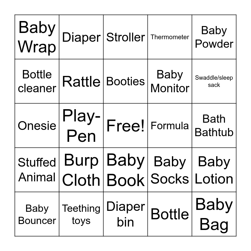 This bingo card has a free space and 32 words: Bottle, Car Seat, Play- Pen, High Chair, Stuffed Animal, Rattle, Baby Powder, Baby Lotion, Diaper, Pacifier, Booties, Stroller, Bib, Breast pump, Formula, Blanket, Baby Bouncer, Onesie, Baby Book, Burp Cloth, Baby Socks, Hooded Towel, Bath Bathtub, Teething toys, Baby Bag, Thermometer, Baby Monitor, Bottle cleaner, Baby Wrap, Diaper bin, White noise machine and Swaddle/sleep sack.