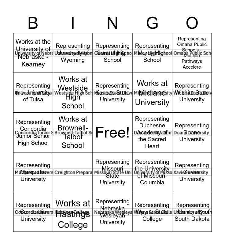 This bingo card has 24 images, a free space and 23 words: Works at Hastings College, Representing Kansas State University, Representing Concordia University, Representing Omaha Public Schools - Multiple Pathways Accelere, Works at the University of Nebraska - Kearney, Representing the University of Tulsa, Representing University of Wyoming, Representing Duchesne Academy of the Sacred Heart, Representing Missouri State University, Works at Midland University, Representing Concordia Junior Senior High School, Representing the University of Missouri-Columbia, Representing Xavier University, Works at Westside High School, Representing Wayne State College, Representing Doane University, Representing Central High School, Representing Wichita State University, Works at Brownell-Talbot School, Representing University of South Dakota, Representing Marquette University, Representing Mercy High School and Representing Nebraska Wesleyan University.