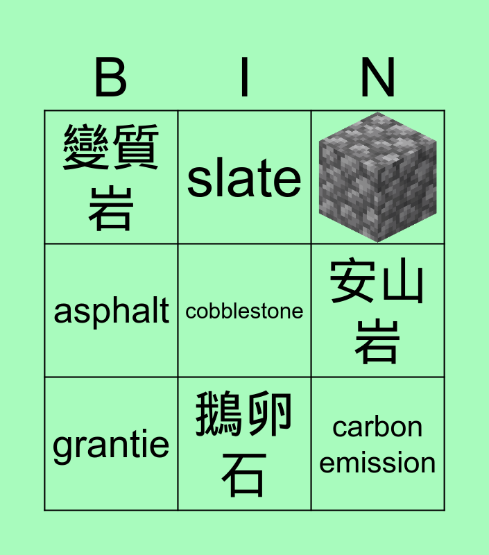 This bingo card has 2 images, a free space and 12 words: petroleum, metamorphic rocks, grantie, slate, asphalt, carbon emission, lava, andersite, 鵝卵石, 變質岩, 板岩 and 安山岩.