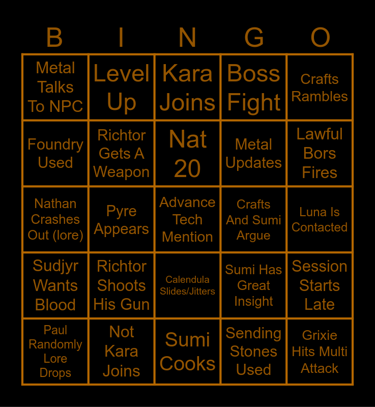 This bingo card has 52 words: Artifact Used, Advance Tech Mention, Metal Shields Someone, Sumi Cooks, Richtor Shoots His Gun, Nelson Mandela, Level Up, Nat 1, Foundry Used, Crafts Is Blunt, Richtor Gets A Weapon, Sumi Yaps, Session Starts Late, Sumi Has Great Insight, Sudjyr Appears, Gnoble Mention, Nat 20, Crafts And Sumi Argue, Swarf Appears, Crafts Rambles, Pyre Appears, Sending Stones Used, Metal Talks To NPC, Metal Updates, New Lore, Grixie Hits Multi Attack, Richtor Makes Ammo, Crafts Nat 1 then Nat 20, Lawful Bors Fires, New Artifact Gained, Chaos Refight, Boss Fight, Town Quest Complete, Working In Town, 4th Wall Break, Kara Joins, Not Kara Joins, Kara Misses Half Atks, Kara Silences Yapper, Sumi Offers Food, Pandora Does Something, Luna Is Contacted, Sudjyr Wants Blood, Swarf Makes Reference, Calendula Slides/Jitters, Sumi Spins Into Abyss, Crafts Re-invents Something, Nathan Crashes Out (lore), Walter Doesn't Use Voice Changer, Someone Called Prev Char Name, Paul Randomly Lore Drops and Sudjyr Loses / Gets Mad.