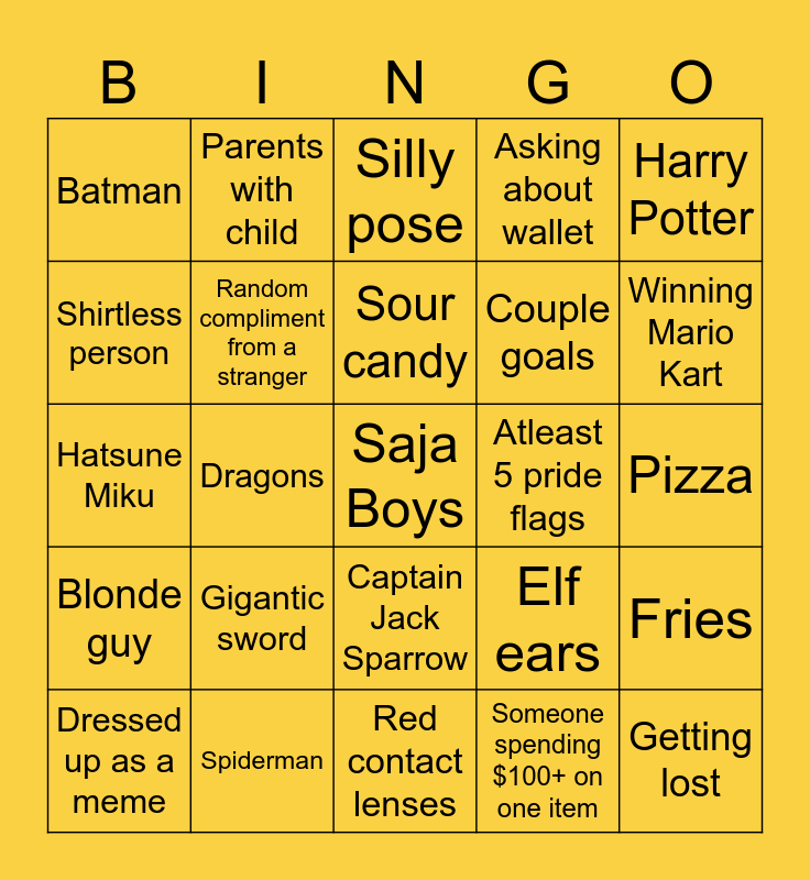 This bingo card has 50 words: Donuts, Saja Boys, A Kpop stan, Red contact lenses, Gigantic sword, Furry, Parents with child, Anime character, Shirtless person, Link and/or Zelda, Random compliment from a stranger, Asking about wallet, Fries, Elf ears, "Can I take a photo with you?", Bright colored wig, Sour candy, Atleast 5 pride flags, Two-toned hair, Harry Potter, Dragons, Someone spending $100+ on one item, Batman, Couple goals, Merch with curse words, Getting lost, Winning Mario Kart, Free stuff, Silly pose, Captain Jack Sparrow, Taking photos of random things, HUNTR/X, Hermitcraft Reference, BTS reference, Spiderman, Derpy Tiger, Naruto, Ships a toxic ship, Massive dress, Pizza, Boba, Demon, Random cute guy/girl, Inflatable ostume, Dressed up as a meme, Hatsune Miku, Questionable body pillows, Stray Kids reference, Blonde guy and Deku.