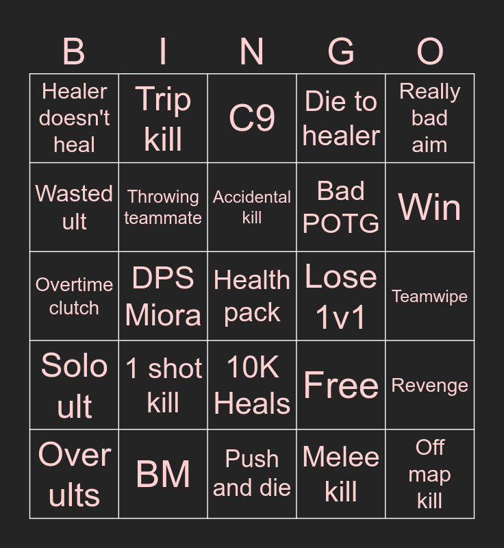 This bingo card has 25 words: 1 shot kill, Push and die, Accidental kill, Over ults, Really bad aim, Healer doesn't heal, Wasted ult, Trip kill, Lose 1v1, 10K Heals, Bad POTG, Overtime clutch, Free, Revenge, Throwing teammate, Off map kill, Teamwipe, C9, Win, DPS Miora, Health pack, BM, Solo ult, Die to healer and Melee kill.