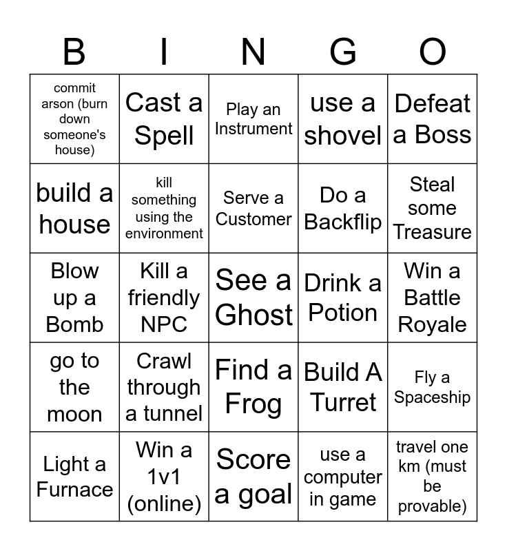 This bingo card has 25 words: Crawl through a tunnel, Score a goal, Serve a Customer, Light a Furnace, Defeat a Boss, commit arson (burn down someone's house), build a house, Cast a Spell, Drink a Potion, Find a Frog, Do a Backflip, Blow up a Bomb, Build A Turret, Fly a Spaceship, kill something using the environment, travel one km (must be provable), Win a Battle Royale, Play an Instrument, Steal some Treasure, Kill a friendly NPC, See a Ghost, Win a 1v1 (online), go to the moon, use a shovel and use a computer in game.