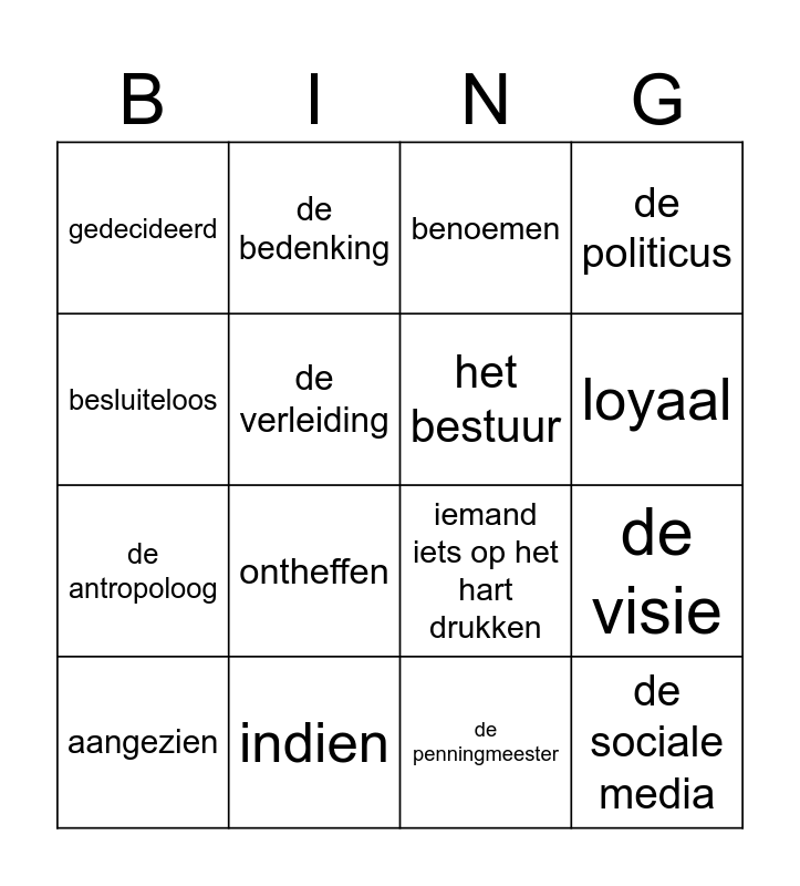 This bingo card has 25 words: Free!, oprecht, loyaal, hecht, besluiteloos, gedecideerd, de verleiding, de bedenking, indien, leiden tot, de antropoloog, iemand iets op het hart drukken, de voorzitter, de tijd zal het leren, het bestuur, de secretaris, de penningmeester, benoemen, ontheffen, de visie, aangezien, waarderen, de sociale media, de politicus and leven in de brouwerij brengen.