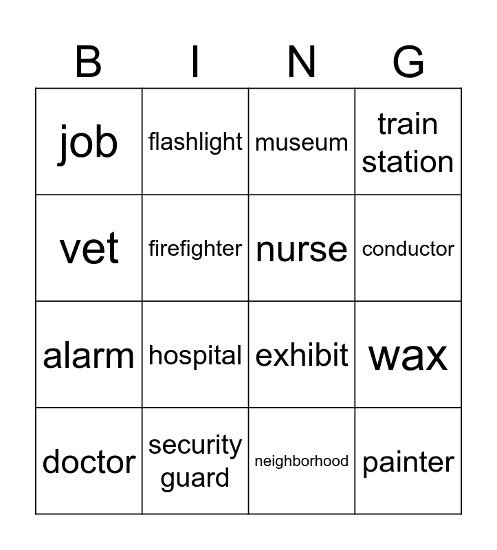 This bingo card has 16 words: security guard, wax, museum, job, alarm, flashlight, exhibit, neighborhood, vet, firefighter, doctor, train station, hospital, conductor, nurse and painter.