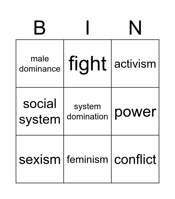 This bingo card has a free space and 8 words: power, activism, fight, sexism, male dominance, conflict, social system and feminism.