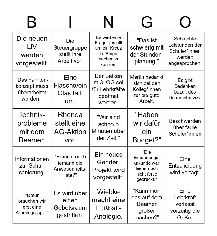 This bingo card has 43 words: Den examinierten LiV wird gratiuliert., "Wir sind schon 5 Minuten über der Zeit.", Eine Lehrkraft kommt zu spät., "Dafür brauchen wir erst eine Arbeitsgruppe.", Dem Protokoll der letzten Geko wird zugestimmt., "Kann man das auf dem Beamer größer machen?", Es wird eine Frage gestellt um ein Kreuz im Bingo machen zu können., "Wir haben Zeit gut gemacht.", Schlechte Leistungen der Schüler*innen werden angesprochen., Es wird über einen Gebetsraum gestritten., "Das ist schwierig mit der Stunden-planung.", "Haben wir dafür ein Budget?", Ein neues Gender-Projekt wird vorgestellt., "Braucht noch jemand die Anwesenheits-liste?", Martins Hose reißt., Wiebke macht eine Fußball-Analogie., "Das gibt es bei Frau Kraft.", Technik-probleme mit dem Beamer., Geist von Ernst Reuter wird erwähnt., Es gibt Bedenken bezgl. des Datenschutzes., Die Steuergruppe stellt ihre Arbeit vor., Nadja ist dagegen., Eistimmige Zustimmung., Die neuen LiV werden vorgestellt., Jemand befürchtet selbst etwas organisieren zu müssen., Beschwerden über faule Schüler*innen, Der Ablauf der BO-Wochen wird präsentiert., Jemand erhält eine Ernennungs-urkunde., "Die Ernennungs-urkunde war leider noch nicht fertig gedruckt.", Informationen zur Schul-sanierung., Nadja hat eine Nachfrage., Eine Entscheidung wird vertagt., Antrag auf Anschaffung einer Karaoke-Maschine., Rhonda stellt eine AG-Aktion vor., "Das findet ihr im Schulportal.", Beschwerden über die Nutzung von KI, Eine Lehrkraft verlässt vorzeitig die GeKo., Der Balkon im 3. OG soll für Lehrkräfte geöffnet werden., "Das Fahrten-konzept muss überarbeitet werden.", Martin bedankt sich bei den Kolleg*innen für die gute Arbeit., Dominiks Kaffeemaschine läuft und stört den Redebeitrag., Eine Flasche/ein Glas fällt um. and Anne erinnert an die Überwachsungslisten der Klassenkonten..