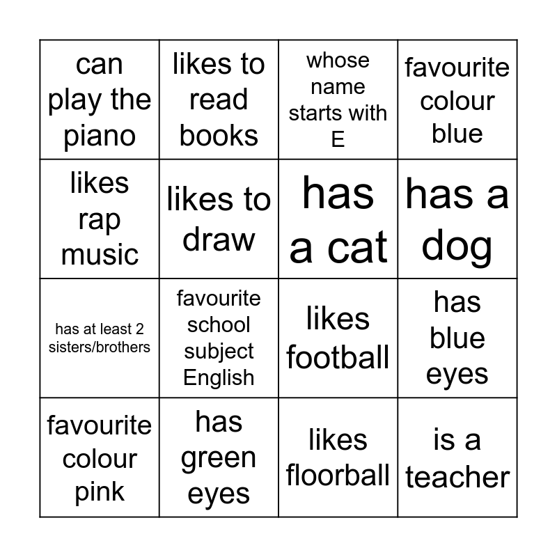 This bingo card has 16 words: has green eyes, has blue eyes, whose name starts with E, can play the piano, has at least 2 sisters/brothers, likes to read books, likes football, likes floorball, likes rap music, likes to draw, favourite colour pink, favourite colour blue, favourite school subject English, has a dog, has a cat and is a teacher.