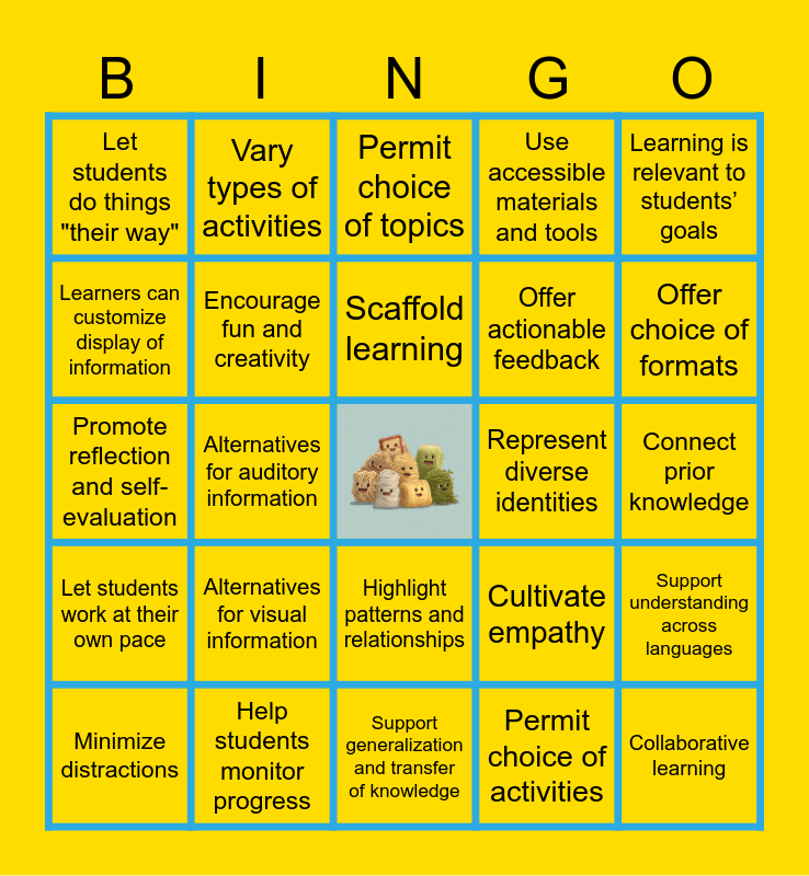 This bingo card has a free space and 37 words: Illustrate through multiple media, Communicate learning goals and objectives, Multiple ways to communicate, Encourage fun and creativity, Support understanding across languages, Alternatives for visual information, Scaffold learning, Multiple ways to respond, Learning is relevant to students’ goals, Clarify vocabulary and jargon, Alternatives for auditory information, Use accessible materials and tools, Collaborative learning, Connect prior knowledge, Learners can customize display of information, Let students work at their own pace, Multiple ways to participate, Permit choice of topics, Highlight patterns and relationships, Represent diverse identities, Let students do things "their way", Offer choice of formats, Minimize distractions, Support generalization and transfer of knowledge, Provide information in different formats, Permit choice of activities, Vary types of activities, Real-world relevance, Help students organize information, Let students preview/ review information, Students feel safe and included, Help students monitor progress, Promote reflection and self-evaluation, Help students set goals, Cultivate empathy, Offer actionable feedback and Address students' personal interests.