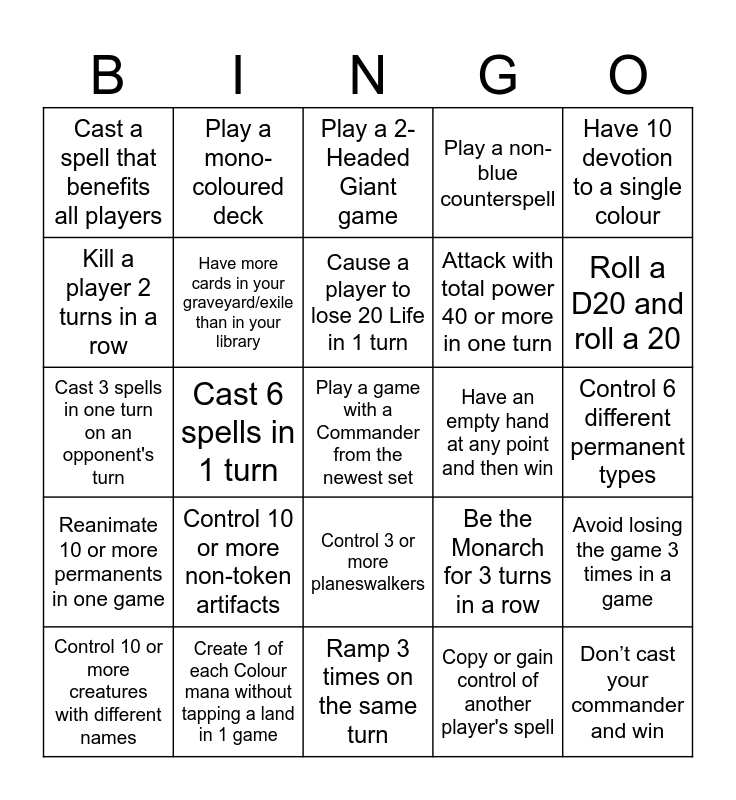 This bingo card has a free space and 24 words: Control 10 or more non-token artifacts, Create 1 of each Colour mana without tapping a land in 1 game, Cause a player to lose 20 Life in 1 turn, Control 10 or more creatures with different names, Have 10 devotion to a single colour, Cast a spell that benefits all players, Kill a player 2 turns in a row, Play a mono-coloured deck, Have an empty hand at any point and then win, Control 3 or more planeswalkers, Attack with total power 40 or more in one turn, Cast 3 spells in one turn on an opponent's turn, Be the Monarch for 3 turns in a row, Avoid losing the game 3 times in a game, Have more cards in your graveyard/exile than in your library, Copy or gain control of another player's spell, Control 6 different permanent types, Play a 2-Headed Giant game, Roll a D20 and roll a 20, Cast 6 spells in 1 turn, Don’t cast your commander and win, Reanimate 10 or more permanents in one game, Play a non-blue counterspell and Ramp 3 times on the same turn.