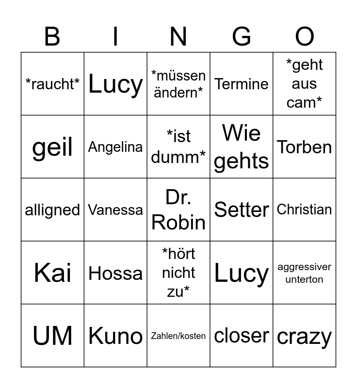 This bingo card has a free space and 24 words: Hossa, Kuno, *ist dumm*, UM, *geht aus cam*, *raucht*, geil, Lucy, Setter, *hört nicht zu*, Wie gehts, alligned, Lucy, aggressiver unterton, Angelina, closer, Christian, *müssen ändern*, Torben, Vanessa, crazy, Kai, Termine and Zahlen/kosten.