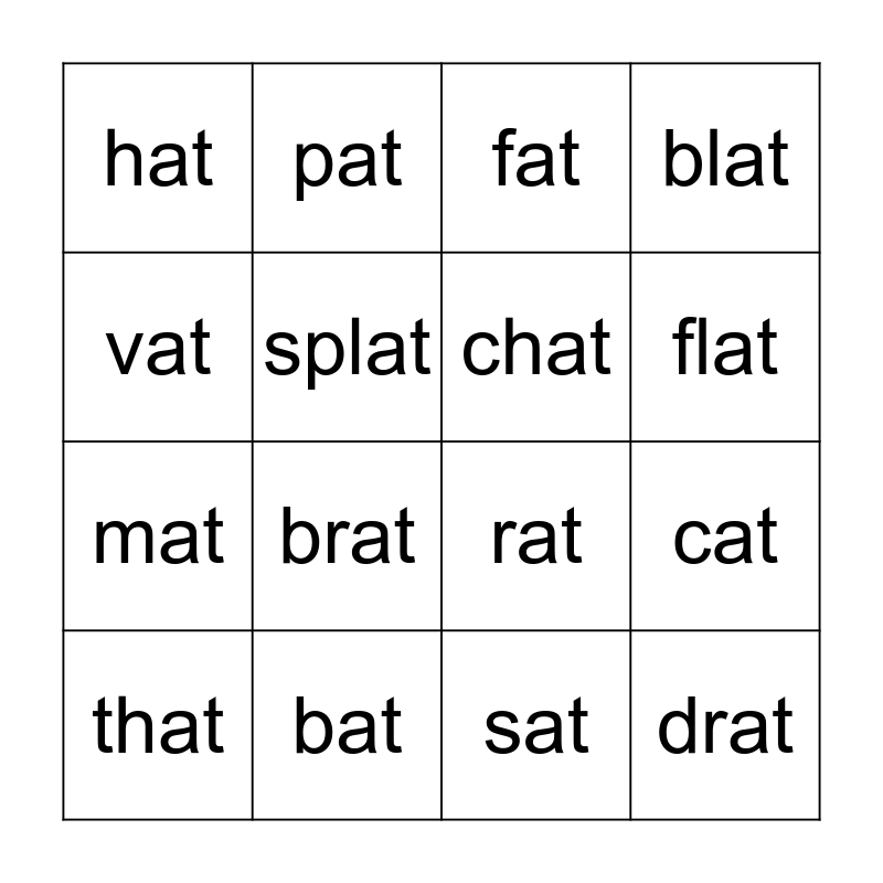 This bingo card has 16 words: bat, cat, fat, hat, mat, pat, rat, sat, vat, splat, that, blat, brat, flat, chat and drat.