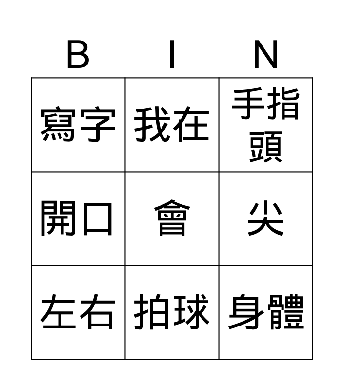 This bingo card has a free space and 8 words: 尖, 手指頭, 我在, 左右, 寫字, 身體, 開口 and 拍球.