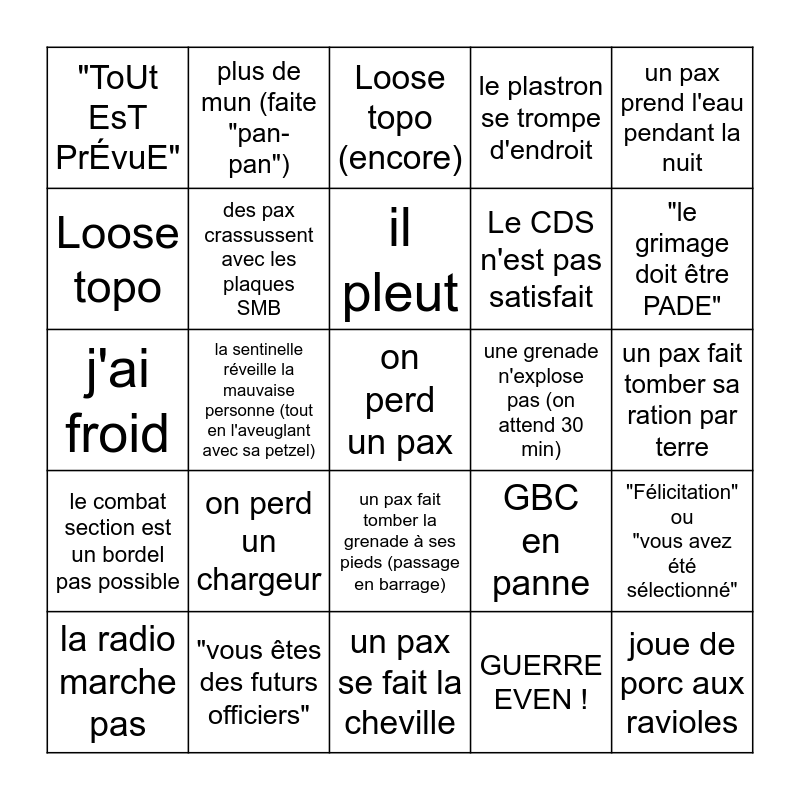 This bingo card has 25 words: on perd un chargeur, un pax se fait la cheville, il pleut, la radio marche pas, un pax prend l'eau pendant la nuit, "ToUt EsT PrÉvuE", Loose topo, plus de mun (faite "pan-pan"), une grenade n'explose pas (on attend 30 min), un pax fait tomber la grenade à ses pieds (passage en barrage), Le CDS n'est pas satisfait, j'ai froid, GBC en panne, "Félicitation" ou "vous avez été sélectionné", des pax crassussent avec les plaques SMB, joue de porc aux ravioles, un pax fait tomber sa ration par terre, Loose topo (encore), "le grimage doit être PADE", la sentinelle réveille la mauvaise personne (tout en l'aveuglant avec sa petzel), on perd un pax, "vous êtes des futurs officiers", le combat section est un bordel pas possible, le plastron se trompe d'endroit and GUERRE EVEN !.