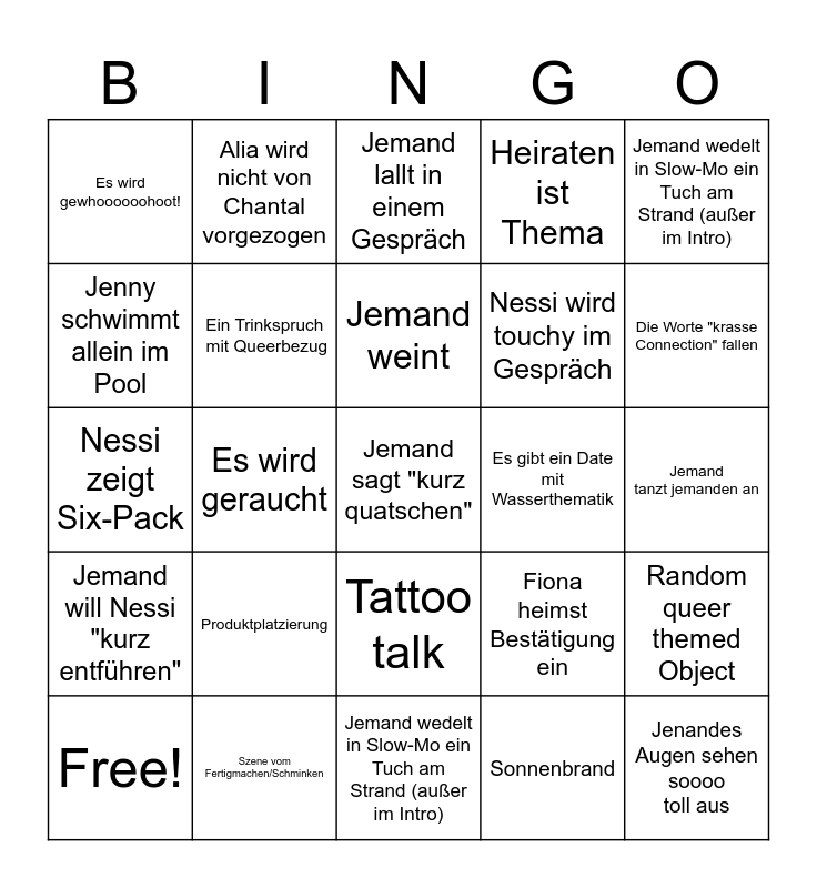 This bingo card has 27 words: Fiona heimst Bestätigung ein, Jenandes Augen sehen soooo toll aus, Nessi wird touchy im Gespräch, Jemand wedelt in Slow-Mo ein Tuch am Strand (außer im Intro), Jenny schwimmt allein im Pool, Jemand lallt in einem Gespräch, Alia wird nicht von Chantal vorgezogen, Jemand will Nessi "kurz entführen", Es gibt ein Date mit Wasserthematik, Random queer themed Object, Nessi zeigt Six-Pack, Heiraten ist Thema, Free!, Szene vom Fertigmachen/Schminken, Die Worte "krasse Connection" fallen, Jemand unterbricht ein Einzelgespräch, Ein Trinkspruch mit Queerbezug, Jemand weint, Produktplatzierung, Es wird gewhoooooohoot!, Jemand tanzt jemanden an, Sonnenbrand, Es wird geraucht, Jemand sagt "kurz quatschen", Tattoo talk, Jemand wedelt in Slow-Mo ein Tuch am Strand (außer im Intro) and Es gibt auf einem Date viel zu viel Essen.