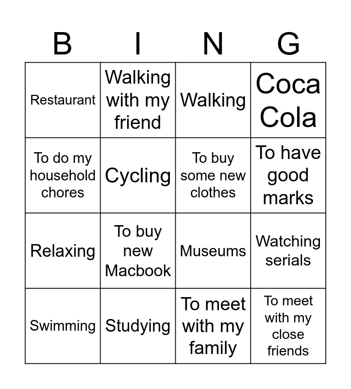 This bingo card has 16 words: Studying, Watching serials, Walking, Restaurant, Relaxing, Walking with my friend, Museums, To meet with my family, To do my household chores, Cycling, Swimming, Coca Cola, To buy new Macbook, To have good marks, To buy some new clothes and To meet with my close friends.