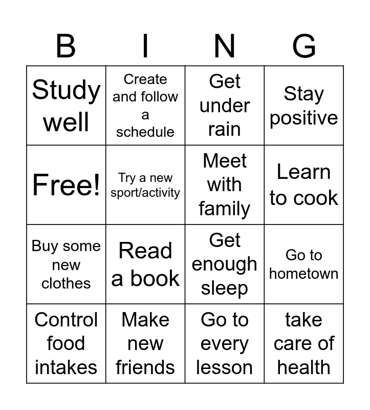 This bingo card has 16 words: Make new friends, Go to hometown, Get under rain, Study well, Buy some new clothes, Create and follow a schedule, Get enough sleep, Go to every lesson, Free!, Try a new sport/activity, Control food intakes, Stay positive, Read a book, Learn to cook, Meet with family and take care of health.